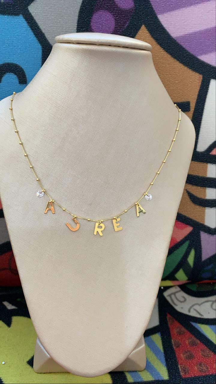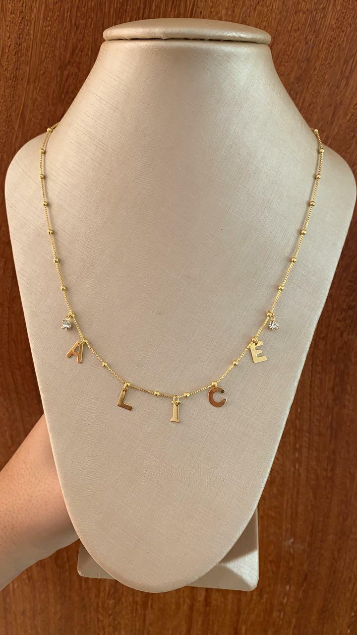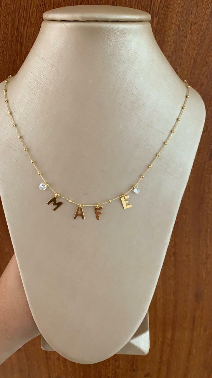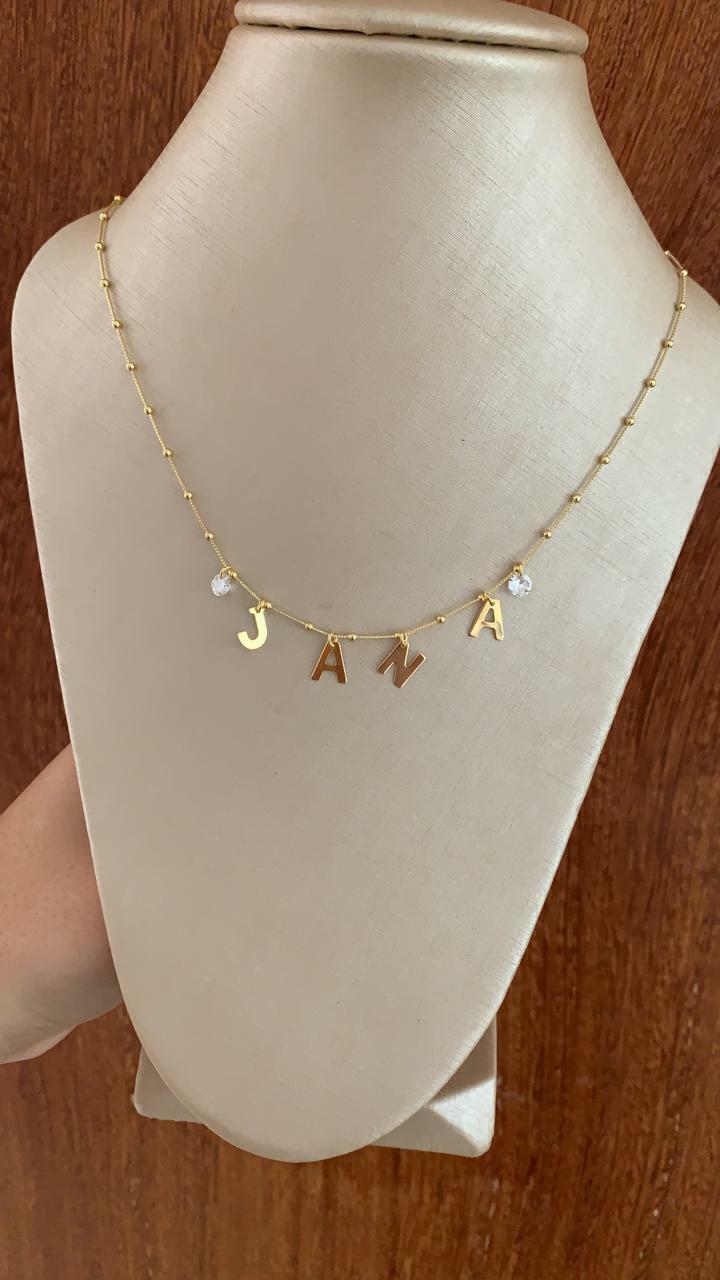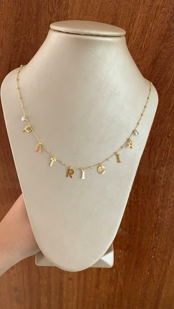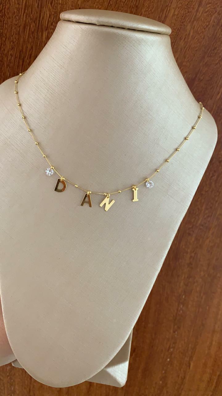 Colar fio veneziana com bolinhas medindo 45 cm, colar com 2 pedrinhas de zircônia e as letrinhas